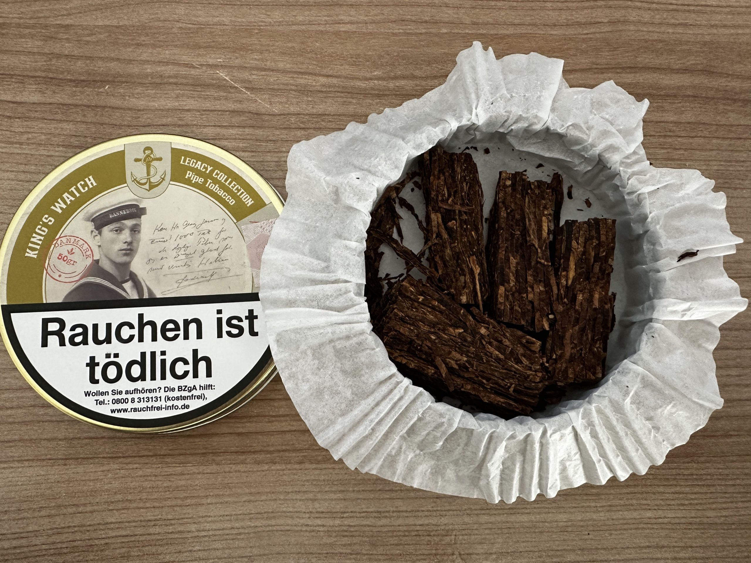 Er kommt in Form eines Tabak-Kuchens, von dem sich zunächst ein Stück abgeschnitten werden muss, um ihn in die Pfeife einzubringen.