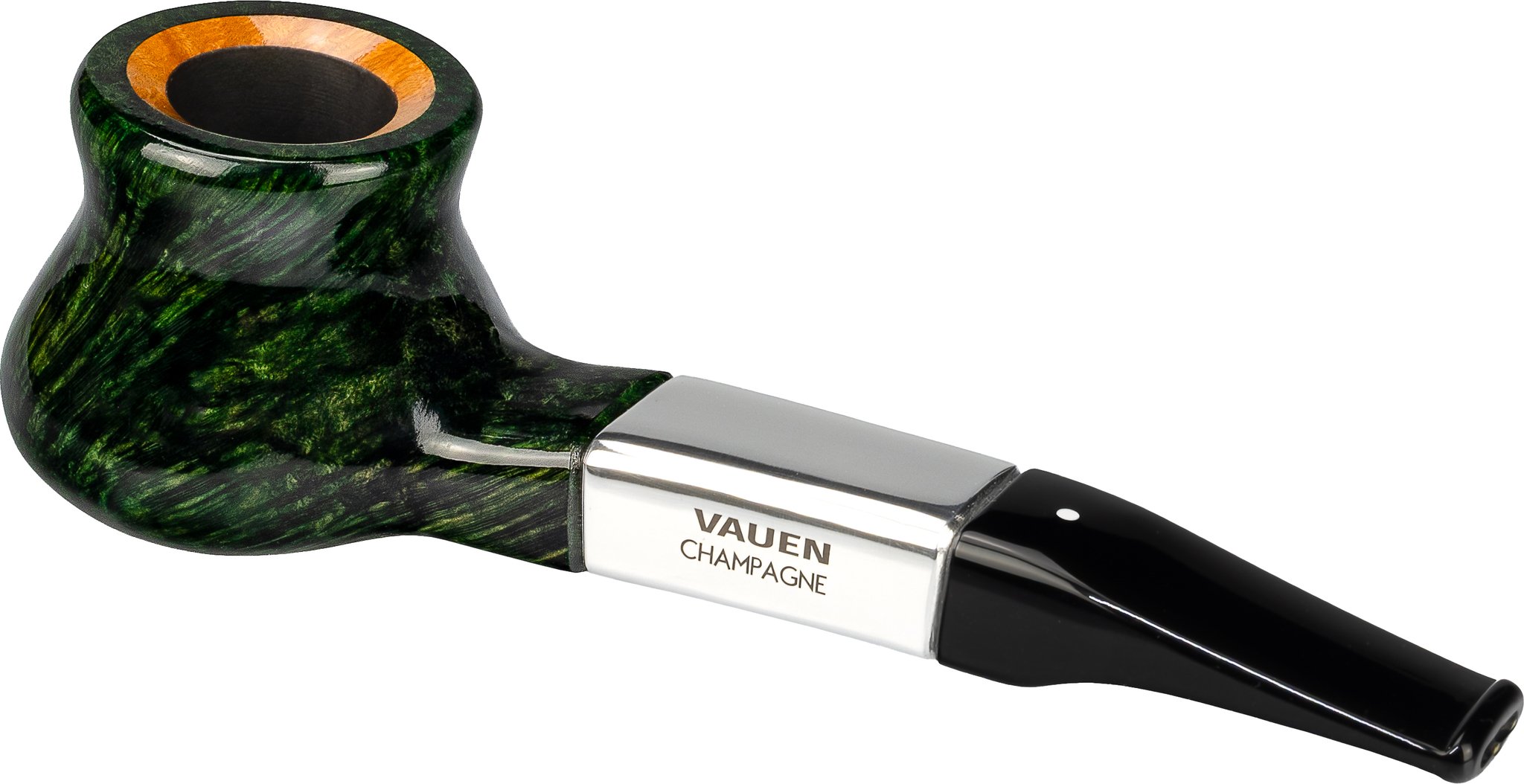 Die Vauen Champagne ist die Fortsetzung der Vauen-Designerreihe. Häufig werden für diese Linie externe Designer beauftragt, ein Pfeifenmodell für Vauen zu kreieren. Dieses Mal wurde der Designer Felix Hoffmann zu Rate gezogen, der in der Vergangenheit schon für Vauen gearbeitet hatte. Das Modell nimmt die Form eines Champagnerkorkens auf und kombiniert es mit einem Aluminiumelement am Holm. Damit der Rauch nicht am kühlen Metall kondensiert und so zu einem Feuchtigkeitsproblem führen kann, ist das Aluminiumelement innen mit einem Holzzapfen ausgekleidet. Erhältlich ist sie in drei Oberflächenvarianten, unter anderem in Dunkelgrün, was derzeit besonders gut bei Vauen-Freunden ankommt.