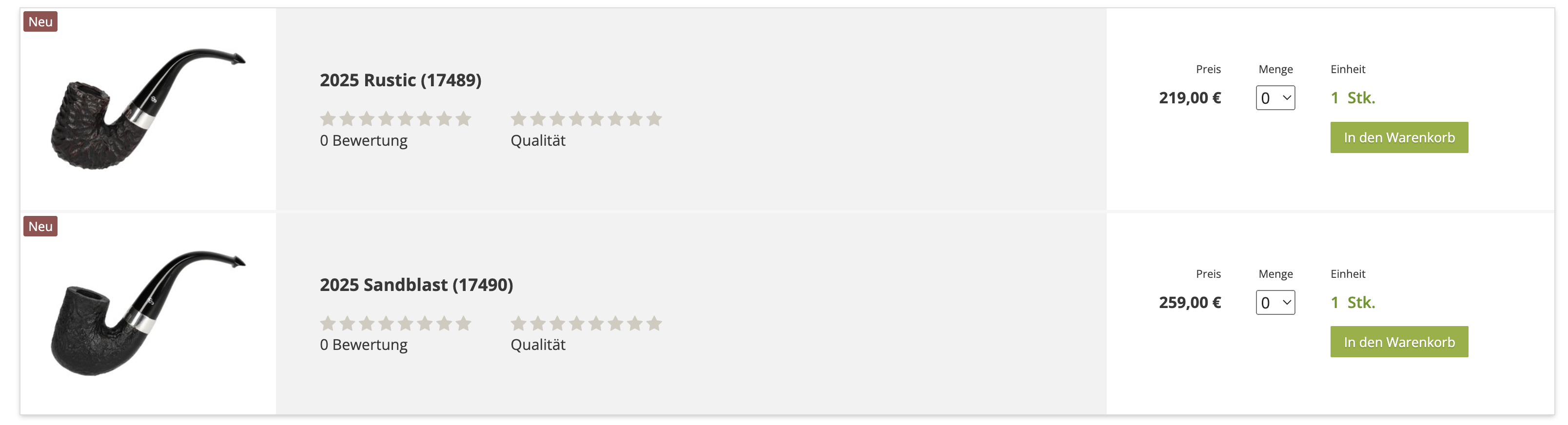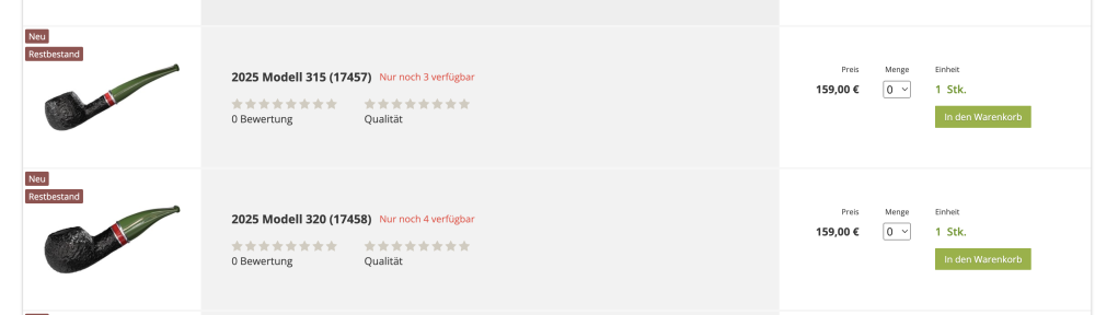 Es sind zahlreiche Editions-, Weihnachts- und Jahrespfeifen eingetroffen, auf die einige Pfeifenraucher schon sehnsüchtig warten. Außerdem eignen sich diese Pfeifen ganz hervorragend als Geschenk. Falls Sie Ihre Lieben darauf aufmerksam machen wollen, was Sie sich zu Weihnachten wünschen, wäre jetzt eine passende Gelegenheit. Wie immer gilt es auch jetzt zu beachten, dass diese Pfeifen nur begrenzt verfügbar sind.